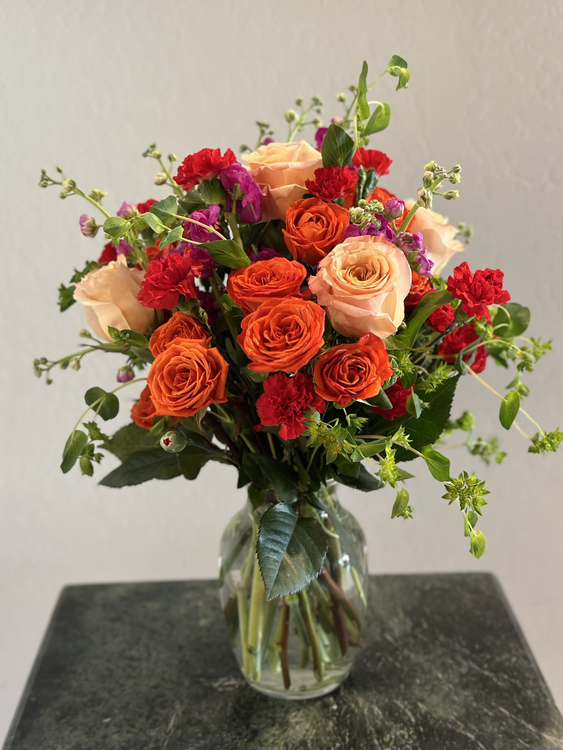 Bright orange spray roses are accented with hot pink stock, red mini carnations and beautifully balanced with peach shimmer roses.
